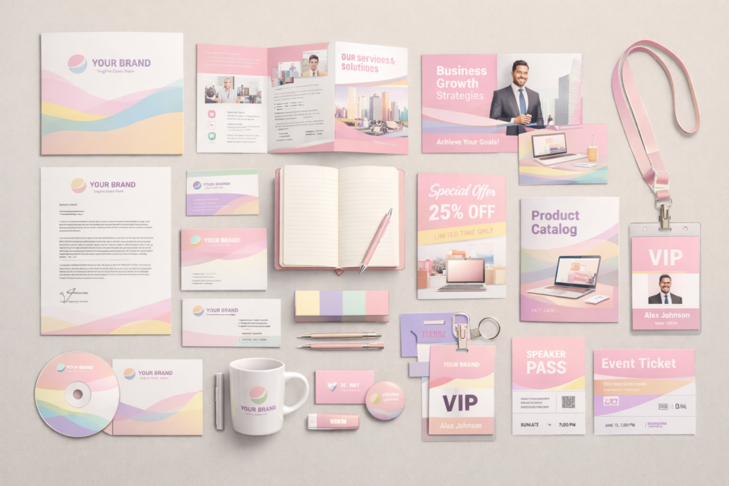 For example, a flyer may capture initial attention. A brochure may provide depth. A branded insert or card may remain on a desk for weeks. Together, these items create layered exposure across time.